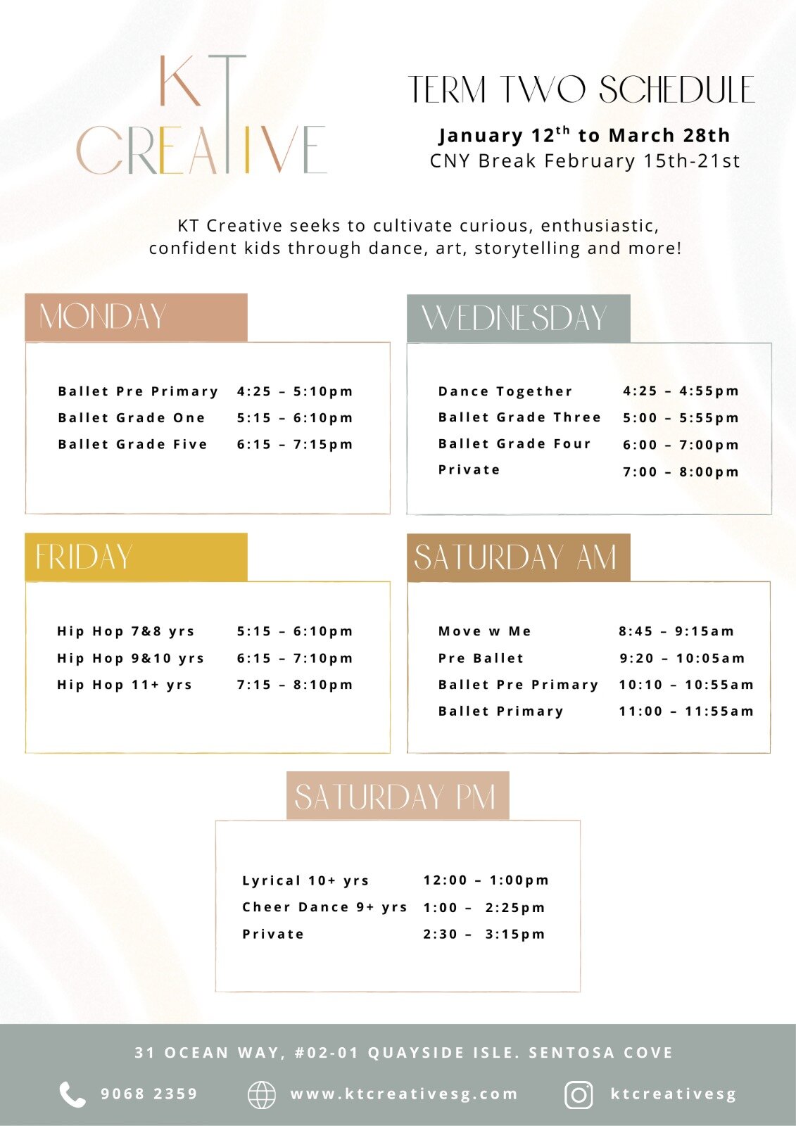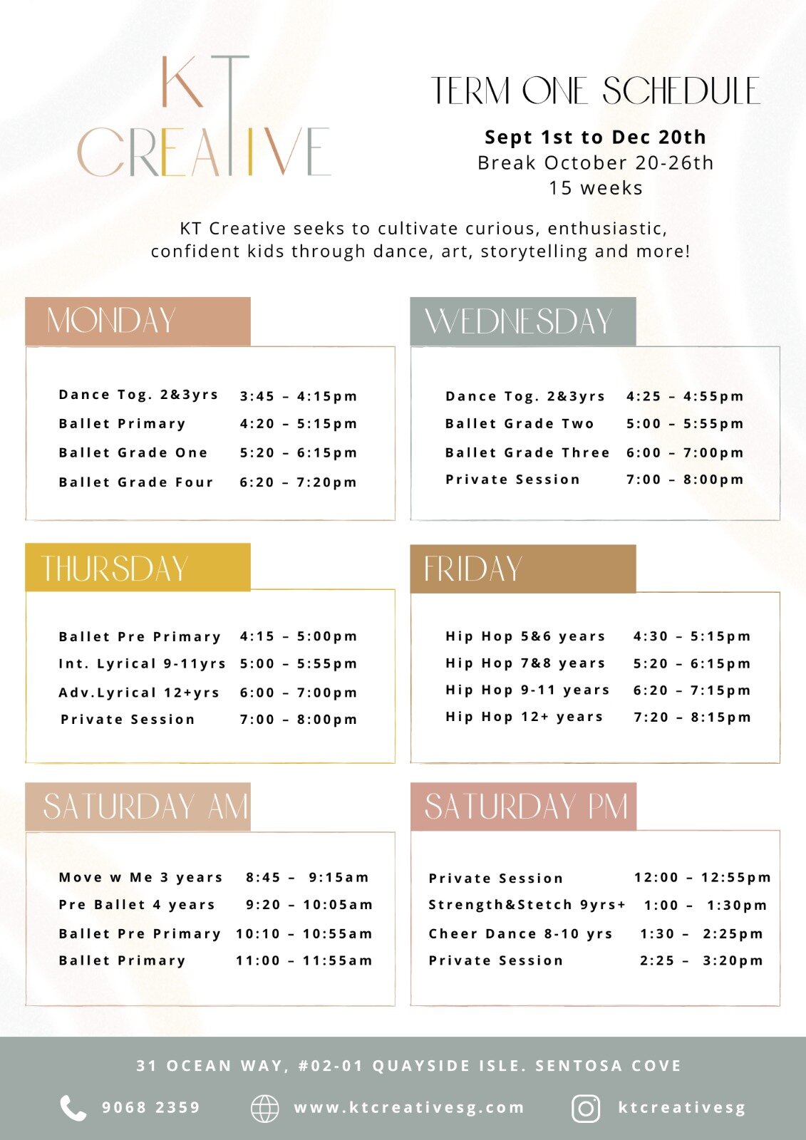 Policy and Procedures are outlined in your welcome email, but please do note that your commitment is for a full term. We are unable to offer refunds or make-up sessions for classes missed nor are the sessions transferable. Should KT Creative cancel a class, a make-up session will be offered in its place at a time the venue is available. No term classes will be held on public holidays from Sept 2022.